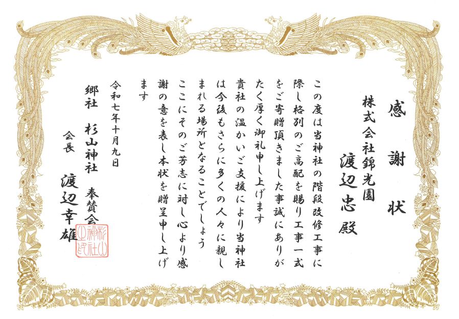 杉山神社様より感謝状